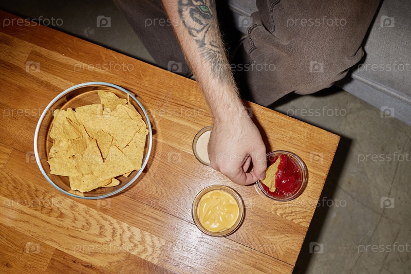 Молодой взрослый мужчина погружает чипсы тортильи в сальсу на деревянном столе