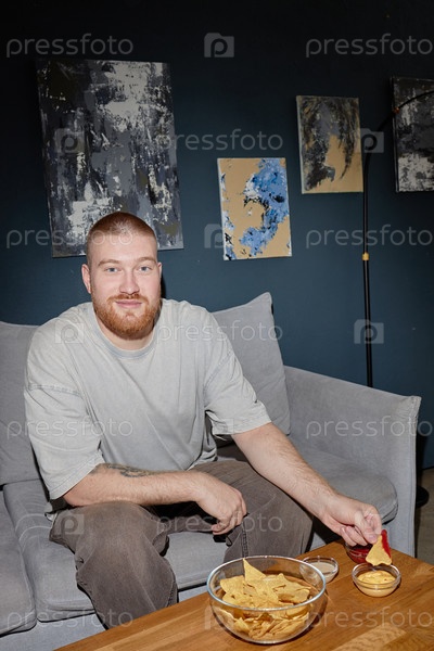 Портрет молодого взрослого мужчины, сидящего в помещении и еда Начо с Дип