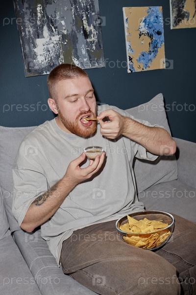 Молодой взрослый мужчина сидит на диване, ест натчо и кушает чипсы