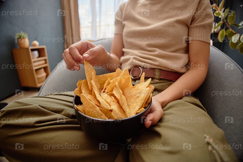 Молодая взрослая женщина ест чипсы с тортильями, сидя в помещении