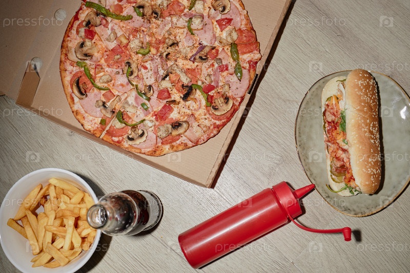 Свежевыпеченная пицца с картофелем и хот-догом на деревянном столе
