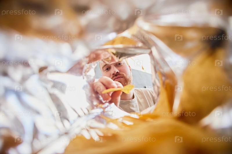 Молодой взрослый мужчина достигает int Snack Bag и Imak Potato Chips