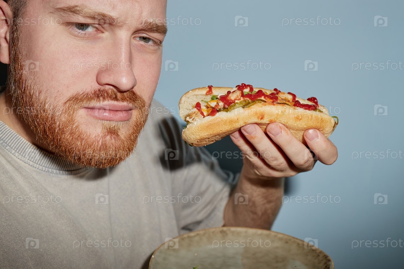 Портрет молодого взрослого мужчины, держащего хот-дога и смотрящего на камеру