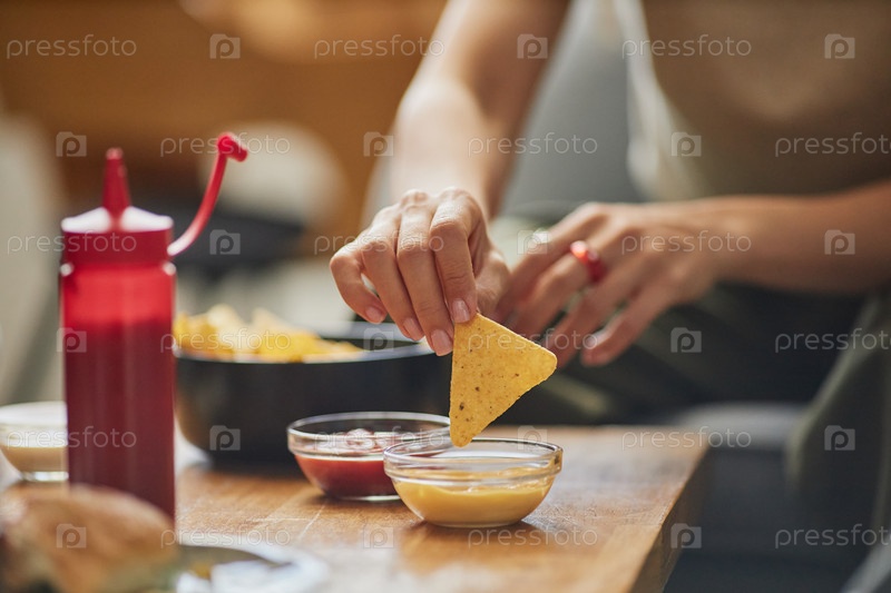 Молодая взрослая женщина погружает чипсы тортильи в сырный соус внутри дома