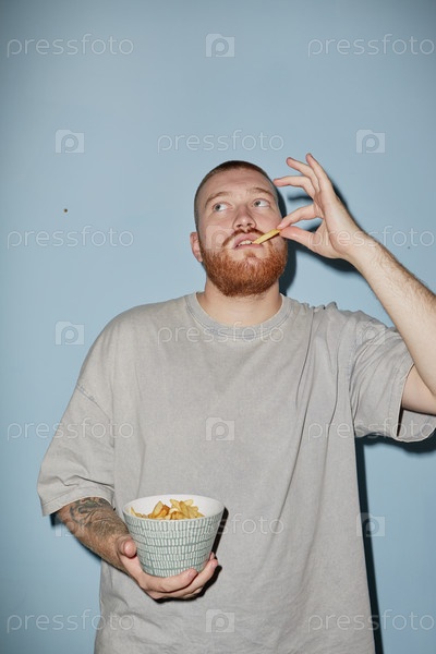 Молодой взрослый мужчина ест картофель фри, держа чашу против голубой стены