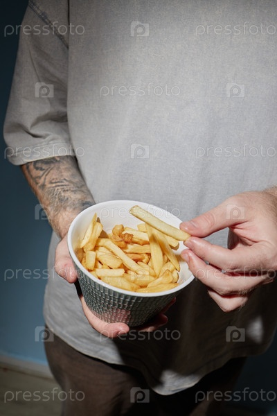 Молодой человек держит миску с картофелем и подбирает фри