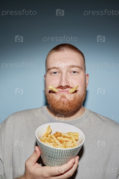 Портрет молодого взрослого мужчины, держащего фри и делающего смешное лицо
