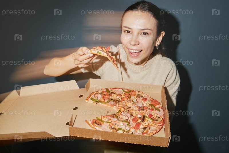 Портрет молодой взрослой женщины, улыбающейся во время еды куска пиццы