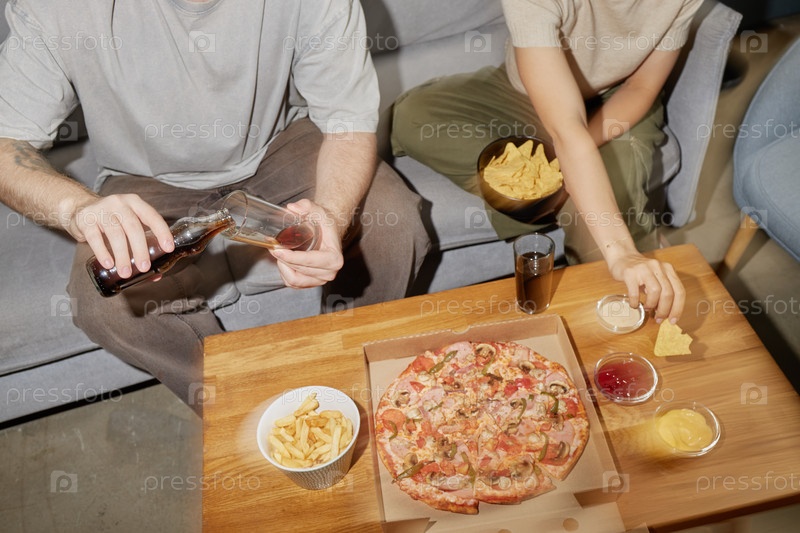 Молодой человек наливает газировку, в то время как молодая женщина достигает начоса