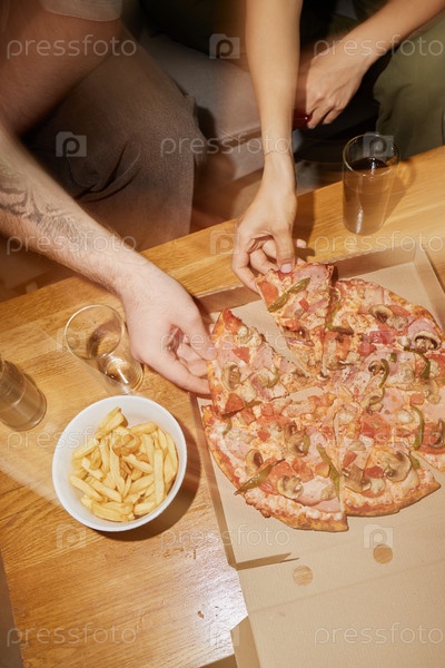 Молодые взрослые делятся пиццей и картофелем во время общественного собрания
