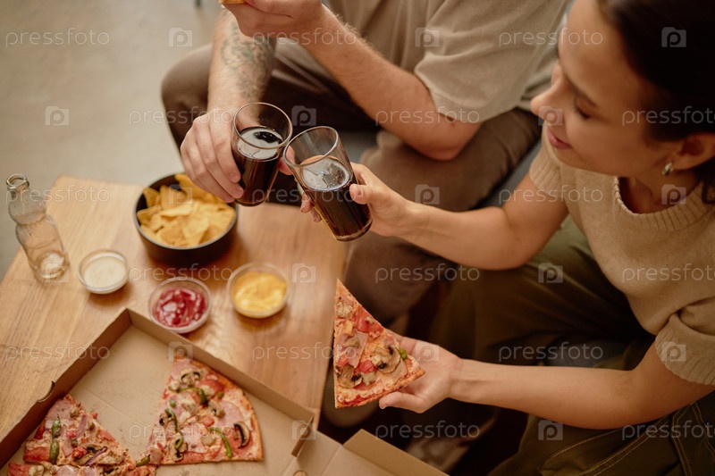 Молодая женщина и татуированный мужчина делятся пиццей и выпекают напитки в помещении