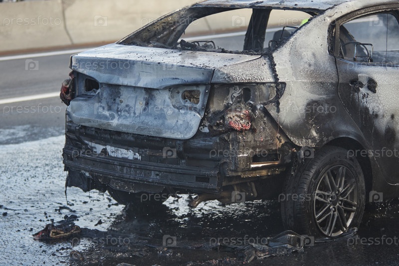 Сгоревший автомобиль остается неподвижным на дороге после тяжелого пожара