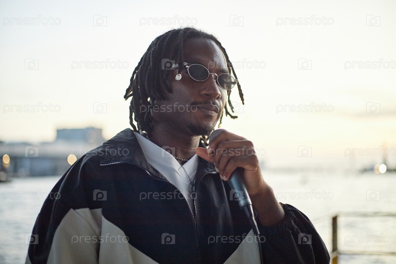 Портрет молодого взрослого чернокожего мужчины, который поет на свежем воздухе во время захода солнца возле набережной