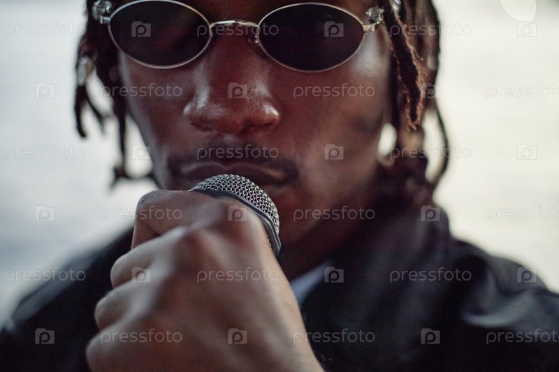 Портрет молодого взрослого чернокожего мужчины, который поет в микрофон на открытом воздухе