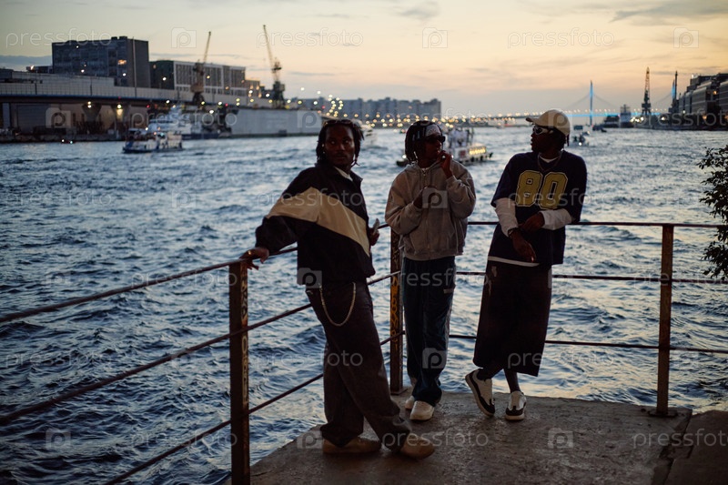 Группа молодых чернокожих мужчин, отдыхающих на берегу озера при закате солнца в городской обстановке