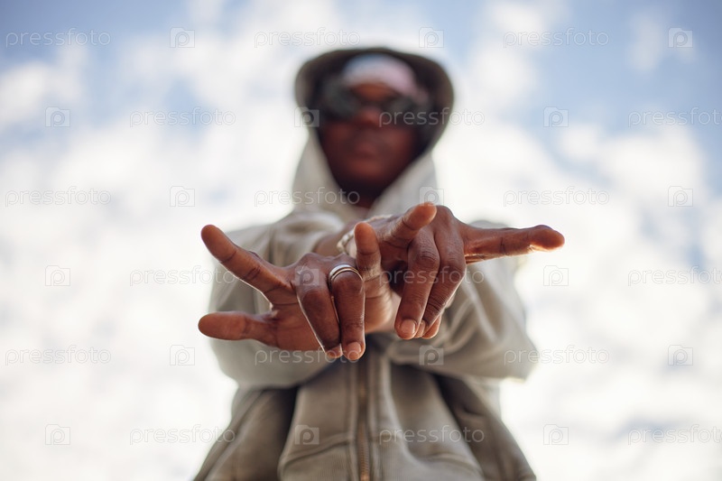 Молодой взрослый чернокожий мужчина жестикулирует руками на открытом воздухе против неба