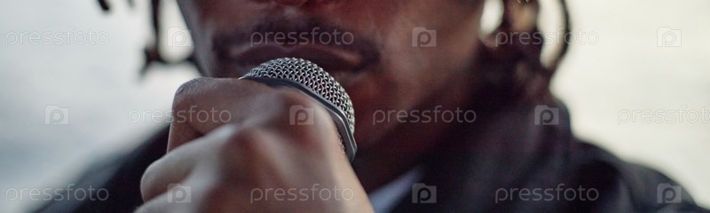 Молодой взрослый чернокожий мужчина выступает с микрофоном во время мероприятия на открытом воздухе
