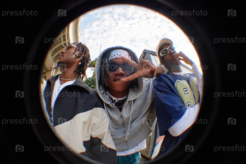 Группа молодых чернокожих мужчин, позирующих на открытом воздухе, делая мирный знак