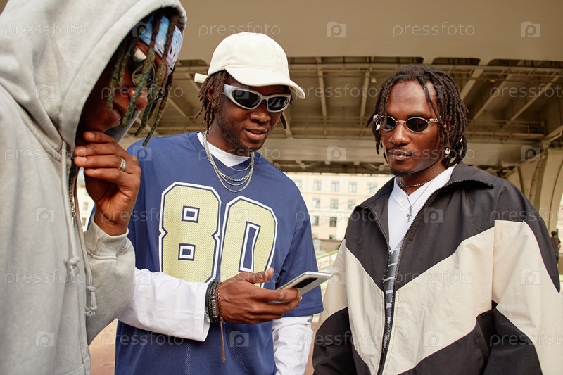 Группа молодых взрослых чернокожих мужчин, общающихся и смотрящих на смартфоны в открытом воздухе