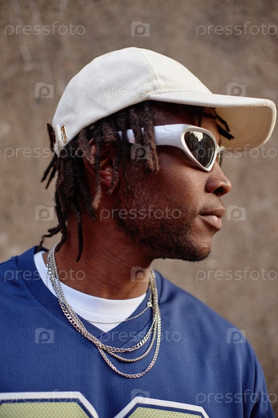 Молодой взрослый чернокожий мужчина в солнцезащитных очках и шляпе стоит на улице