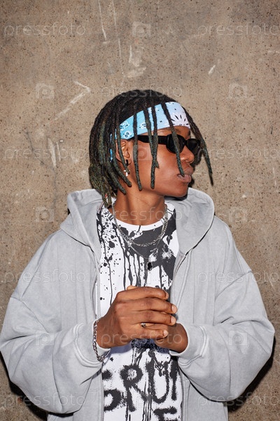 Молодой взрослый чернокожий мужчина с дредольками, носящий бандану и солнцезащитные очки позирует