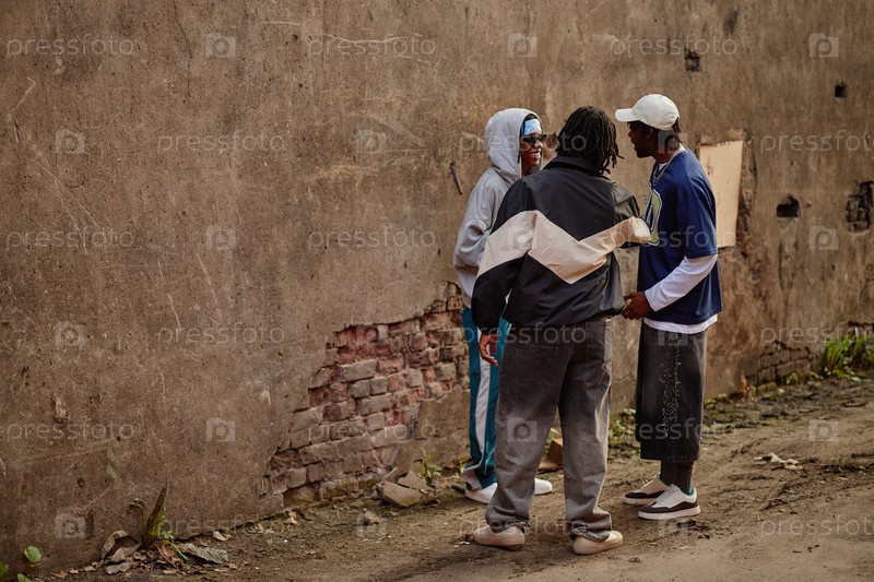 Группа мужчин поколения Z, стоящих и разговаривающих возле старой кирпичной стены