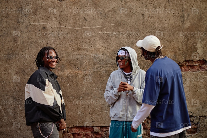 Группа молодых чернокожих мужчин, смеющихся и общающихся на открытом воздухе возле бетонной стены