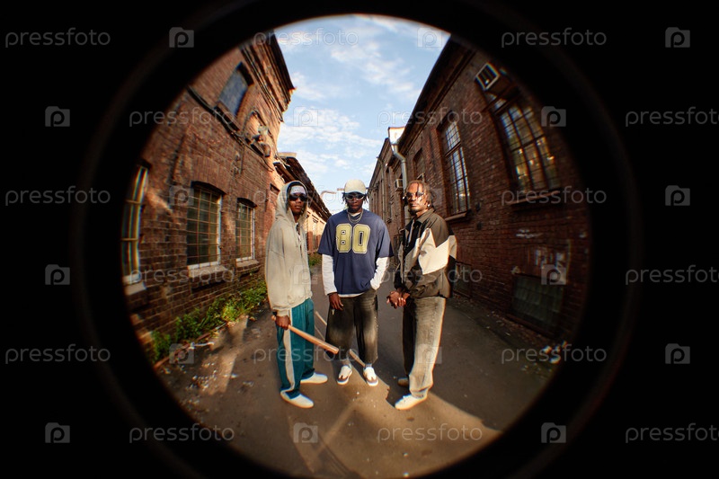 Три молодых взрослых чернокожих мужчины стоят на улице между старыми кирпичными зданиями