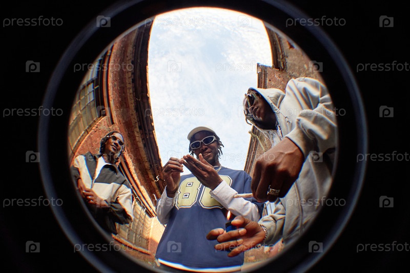 Группа молодых чернокожих мужчин, смеющихся и общающихся на открытом воздухе в городской среде