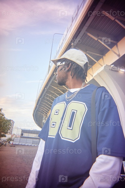 Молодой взрослый чернокожий мужчина стоит на улице под мостом, оглядываясь в сторону