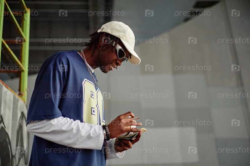 Молодой взрослый чернокожий мужчина считает наличные, стоя в городской среде