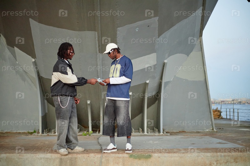 Два молодых чернокожих мужчины обмениваются предметами на открытом воздухе под городской мостовой структурой