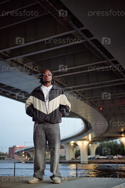 Молодой взрослый чернокожий мужчина уверенно стоит под городским мостом