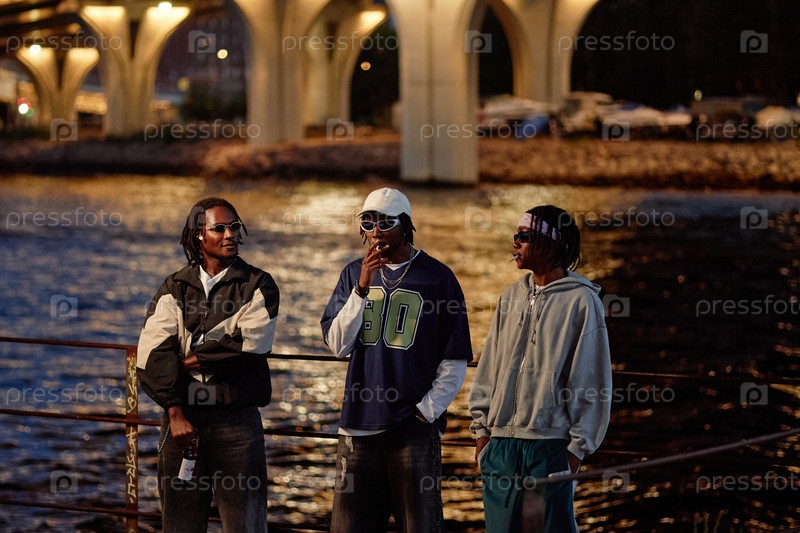 Группа молодых чернокожих мужчин, общающихся на открытом воздухе возле городского аквафронта в Сансет