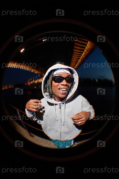 Портрет молодого взрослого чёрного мужчины, улыбающегося на улице ночью под мостом