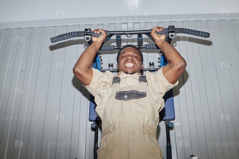 Молодой взрослый чернокожий мужчина тренируется на гимнастической машине в помещении, показывая решимость