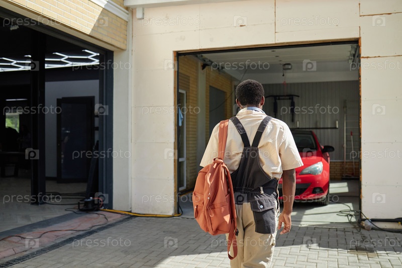 Молодой взрослый чернокожий мужчина ходит к входу в гараж, неся рюкзак