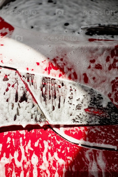 Красный капот автомобиля, промываемый мылом во время процесса очистки транспортного средства