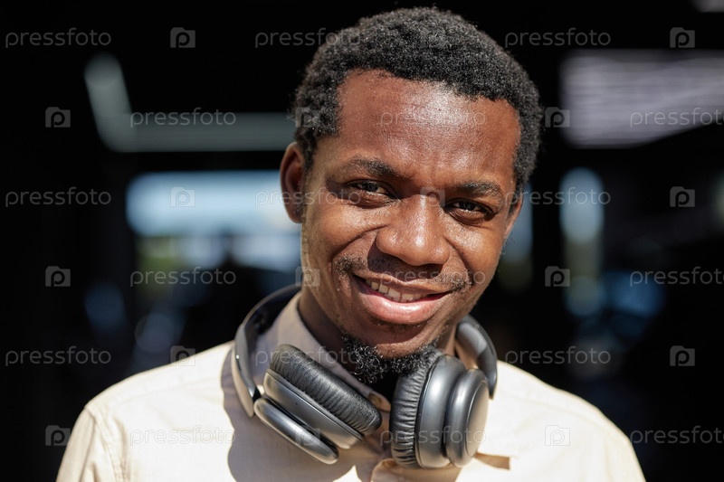 Портрет молодого взрослого чернокожего мужчины, улыбающегося на улице в наушниках