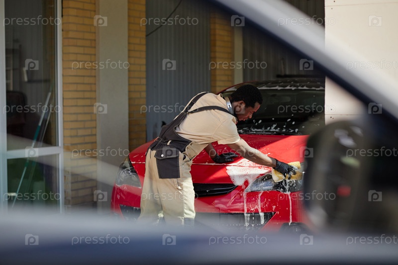 Молодой взрослый чернокожий мужчина моет автоэкстериор в сервисе детализации автомобилей