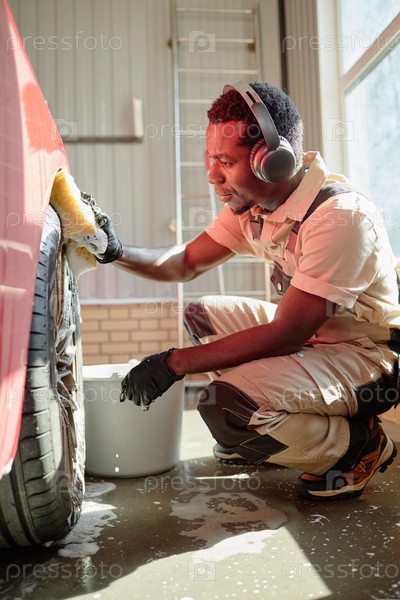 Молодой взрослый чернокожий мужчина, носящий наушники мытье автомобильных шин в помещении