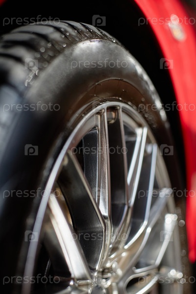 Ближайший снимок блестящего колеса автомобиля, отражающего солнечный свет на улице в дневное время