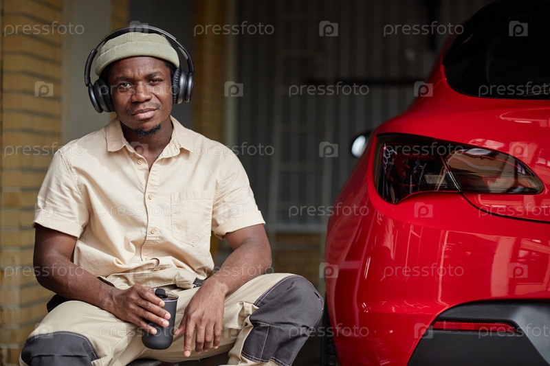 Портрет молодого взрослого чернокожего человека, слушающего музыку, сидящего рядом с красной машиной