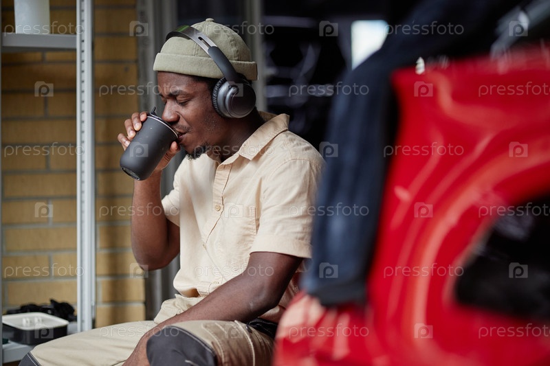 Молодой взрослый чернокожий мужчина слушает музыку и пьёт кофе в помещении