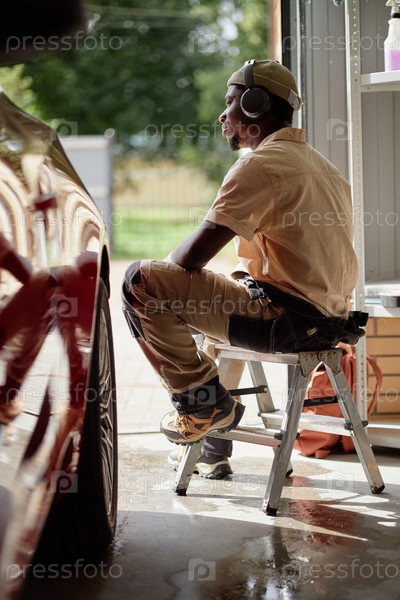 Молодой взрослый чернокожий мужчина с наушниками сидит на лестнице в гараже