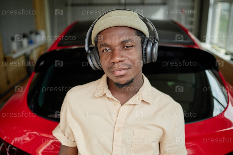 Портрет молодого взрослого чернокожего мужчины с наушниками, стоящего возле машины