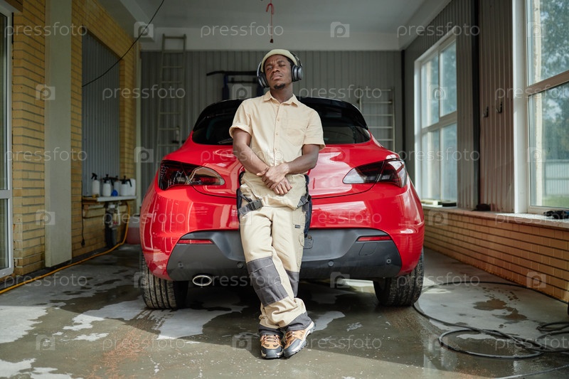 Молодой взрослый чернокожий мужчина слушает музыку, прислонившись к машине в помещении