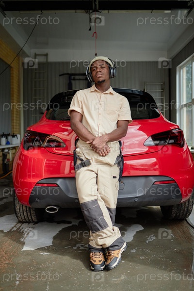 Молодой взрослый чернокожий мужчина слушает музыку, прислонившись к машине