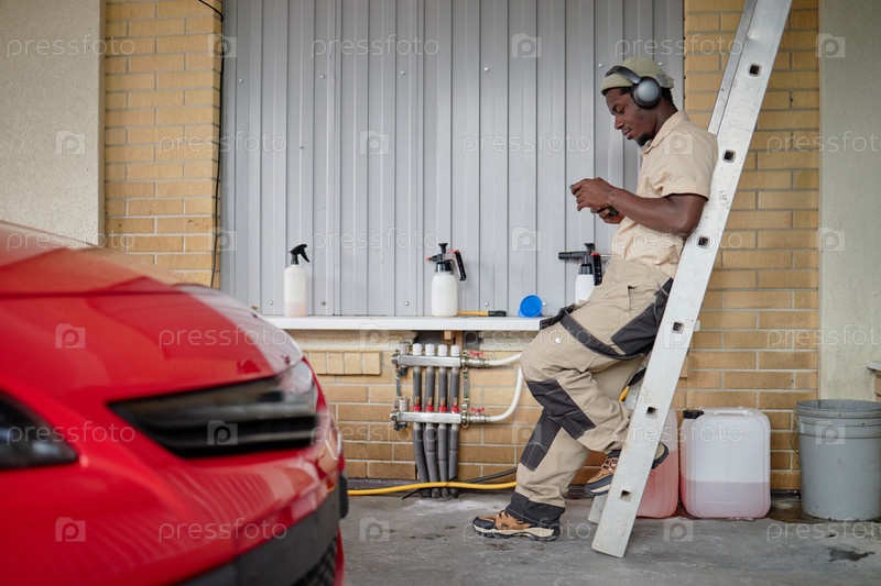 Молодой взрослый чернокожий мужчина слушает музыку и использует смартфон на автомастерской