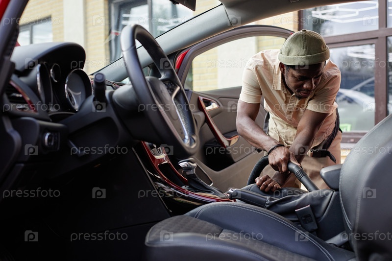 Молодой взрослый чернокожий мужчина убирает интерьер автомобиля с пылесосом в городской обстановке